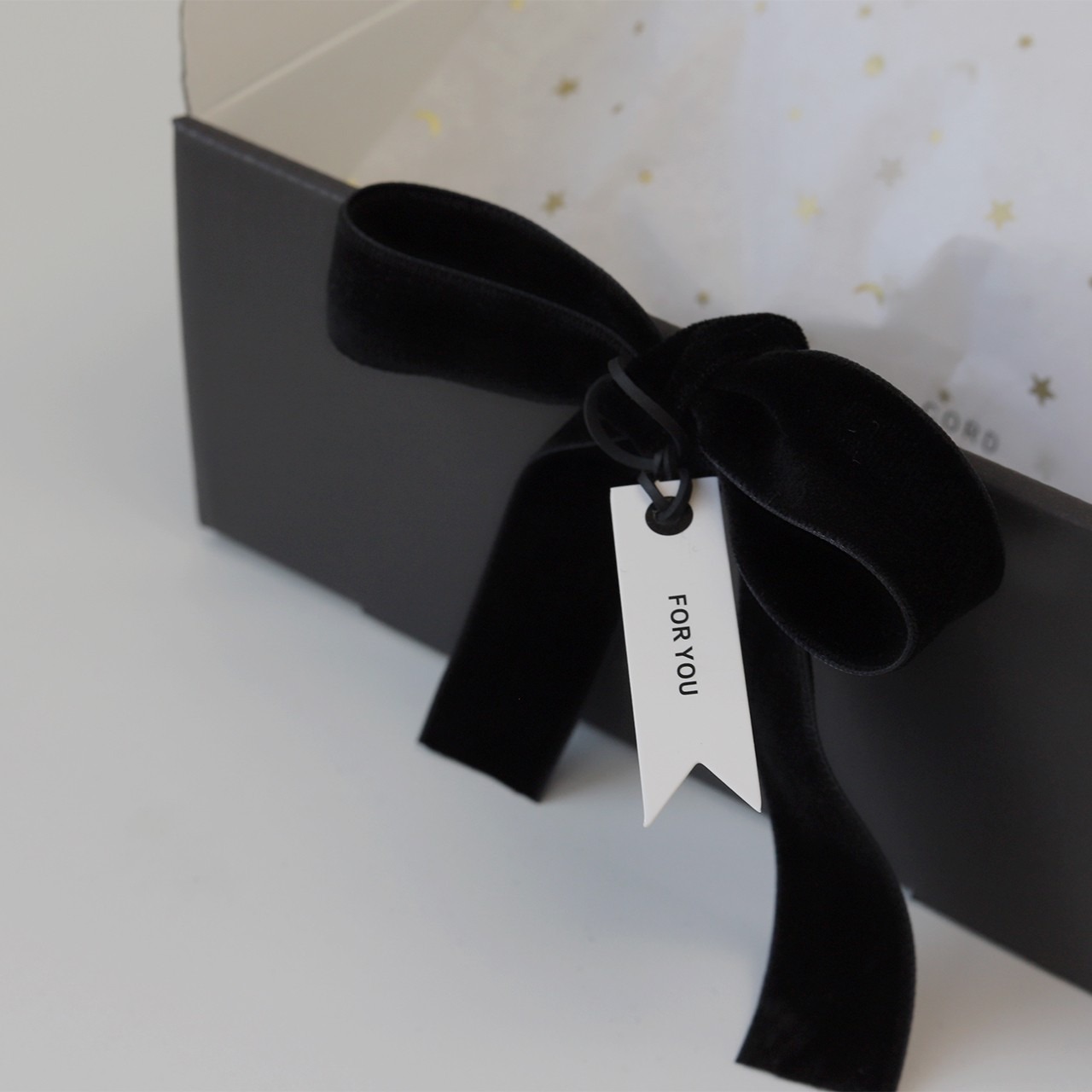 チャコールカラーのお箱に、漆黒の別珍リボンがとーーーってもお上品で、スタッフからも大好評です♡